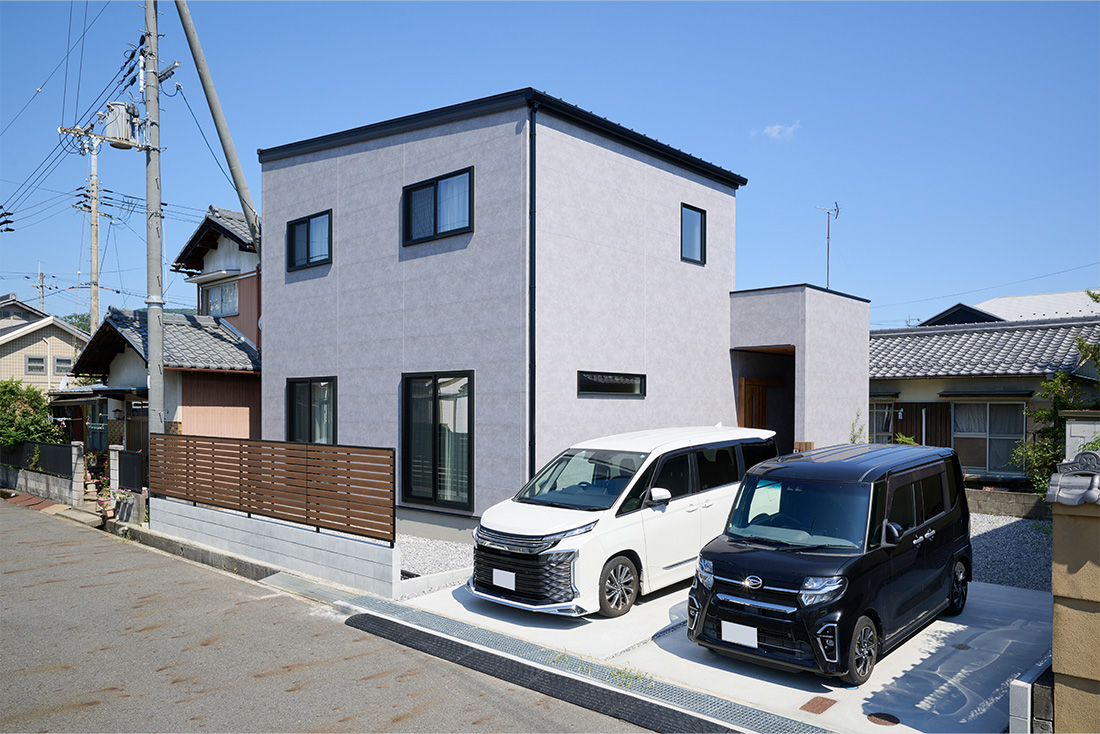 落ち着いた明るいグレーの外観と、広く確保した大きな駐車場。通りから家のなかが見えないよう、奥へとひときわ懐深く造られた玄関ポーチは自転車なども置くこともでき、木目の天井がやわらかな表情を添えています。