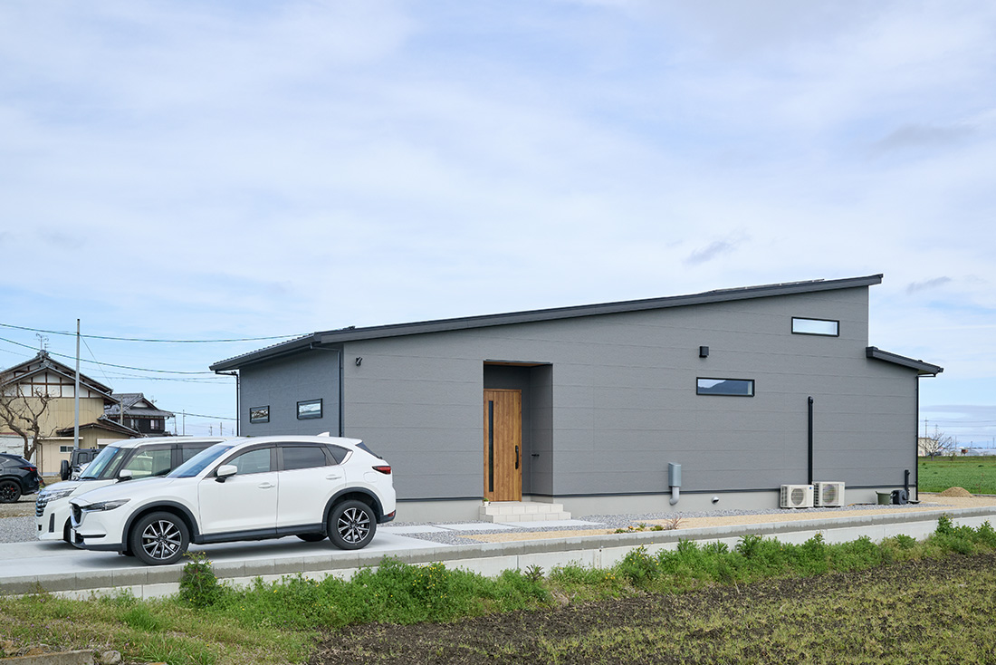 通りに面してはクローズな印象ながら、縦に長い敷地を生かしたのびやかなデザインをもつ平屋の住まい。グレーの落ち着いた色合いに、ウッド調の玄関扉、屋根勾配のシャープなラインがアクセントになっています。高気密・高断熱の住宅性能にこだわり、ECOSの家を選択。光熱費のランニングコストを重視し、太陽光パネルも設置しました。